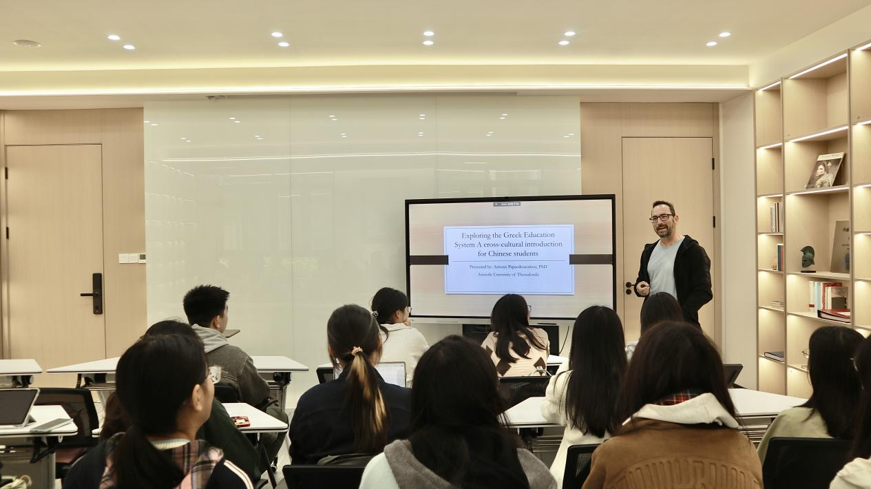 Στις 7 Νοεμβρίου, η σειρά διαλέξεων «Aegean Wisdom Salon» του Κέντρου φιλοξένησε τον καθηγητή Αντώνη Παπαοικονόμου από το Αριστοτέλειο Πανεπιστήμιο Θεσσαλονίκης, ο οποίος παρουσίασε το θέμα «Το ελληνικό εκπαιδευτικό σύστημα – Μια διαπολιτισμική εισαγωγή για Κινέζους φοιτητές». Ο καθηγητής αναφέρθηκε στην ιστορική συνέχεια της ελληνικής εκπαιδευτικής παράδοσης από την αρχαιότητα έως σήμερα και ανέλυσε τη σύνδεση μεταξύ φιλοσοφικής σκέψης, ηθικής αγωγής και κοινωνικής ευθύνης. Μέσα από τη συγκριτική θεώρηση ανέδειξε τις ομοιότητες και διαφορές με το κινεζικό εκπαιδευτικό πλαίσιο, προκαλώντας ζωηρό διάλογο με το ακροατήριο.